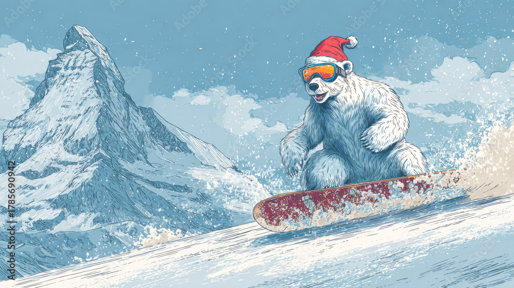 Polar bear snowboarder wearing Santa Claus hat and ski mask. Bear on snowboard on snowy mountain slope, drawn cartoon style. Concept of active recreation on Christmas vacation, extrime winter sports #1785690942