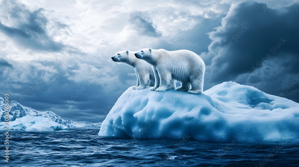 Polar bears standing on a shrinking iceberg, highlighting the impact of global warming on wildlife conservation #1003765003