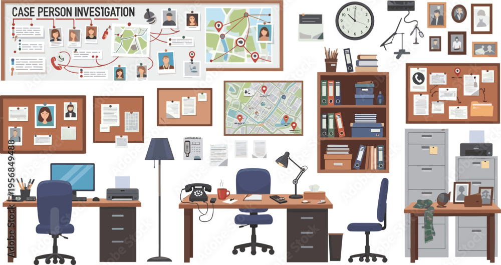 Police Investigation Office Interior with Case Board, Maps, Desks, Filing Cabinet, Bookshelf, Computer Workstations, and Detective Workspace Elements #1956849488