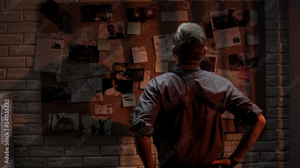 Policeman analyzing information of crime on investigation board, professional #241135232