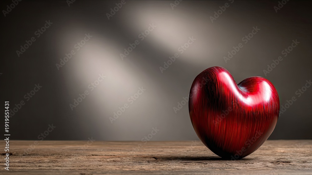Polished deep red heart sculpture rests on aged wooden surface under focused illumination #1919551431