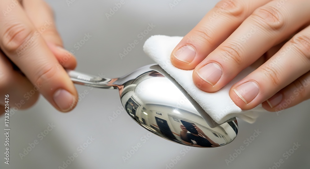 Polishing Silverware: Close-Up of Hands Cleaning a Shiny Spoon with White Cloth #1732621476