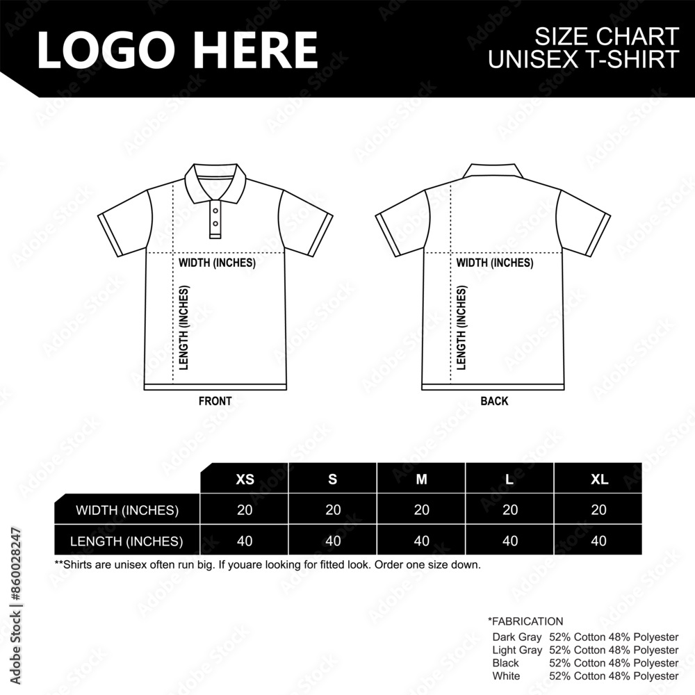 Polo Shirt size guide of unisex short sleeve sizing chart Table size Front and back views Vector illustration. #860028247