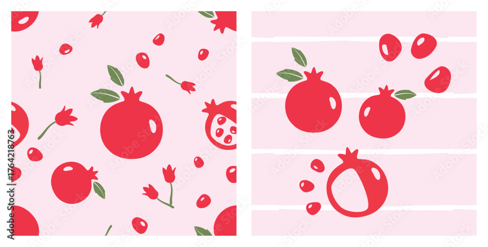 pomegranate seamless patterns on blush pink, whole fruits, halves, seeds and leaves with soft hand-drawn stripes, cute minimal vector repeat for fabric, wrapping and kitchen decor. #1764218763