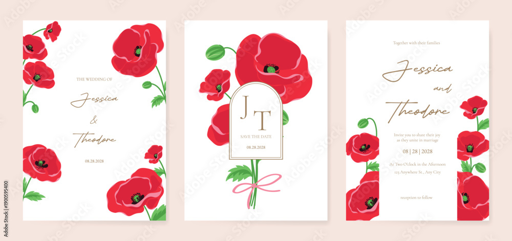 Poppy Flower Wedding Invitation set, floral invite thank you, rsvp modern card Design in Red flower with greenery branches decorative Vector elegant rustic template #1900595400