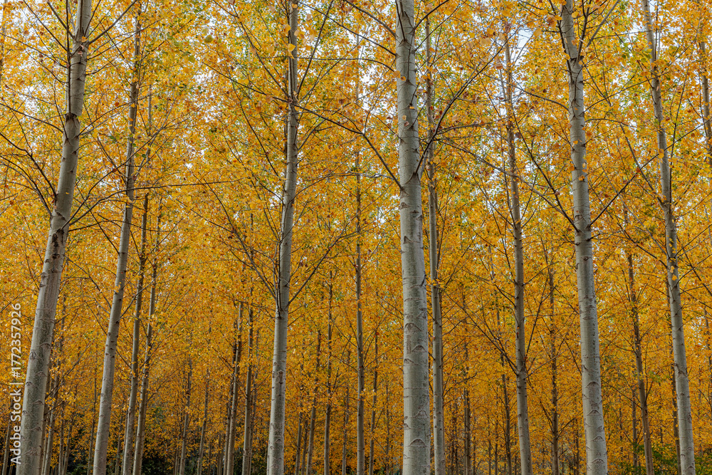Populus canadensis. Canadian poplars in autumn with golden leaves. #1772357926
