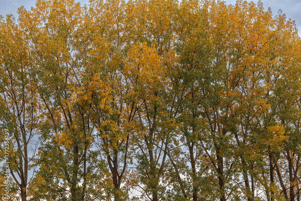 Populus canadensis. Canadian poplars in autumn with green and gold leaves. #1772358139