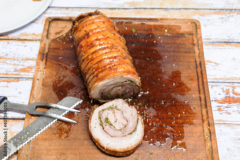 Porchetta ready to be cut when cooked on the barbecue #407394003