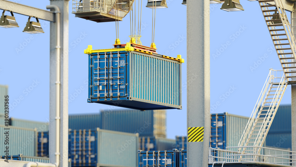Port logistics operations, Cargo handling. Crane lifts shipping container at container terminal for loading, unloading, and intermodal freight transportation, 3d image #1901237585
