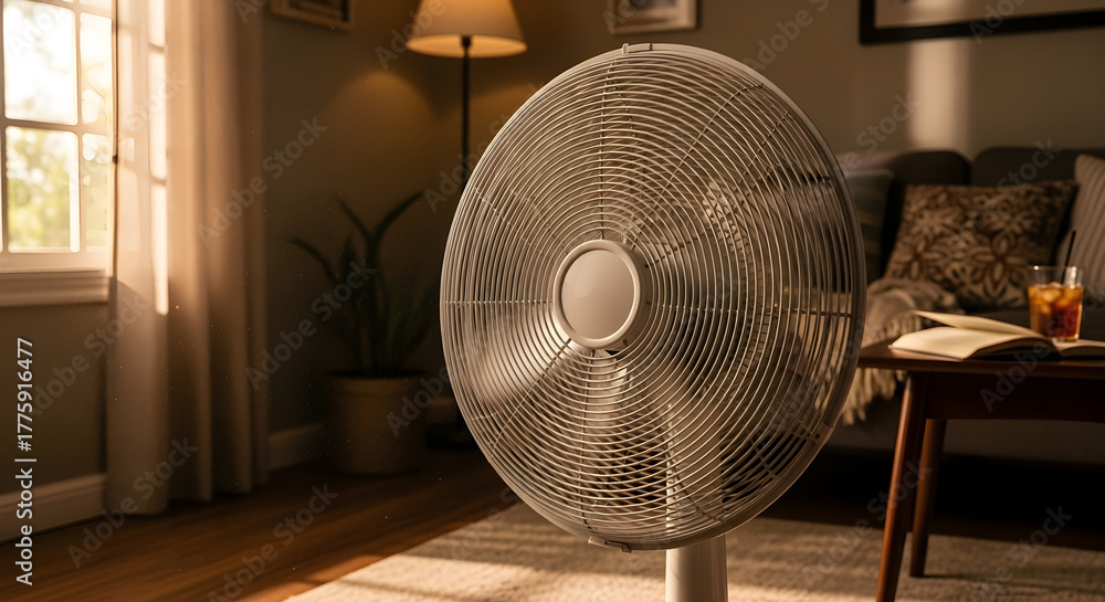 Portable fan cooling a cozy living room during summer heat #1775916477