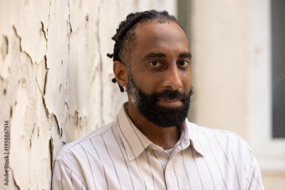 Portrait d'un bel homme souriant, noir d'origine antillaise, barbu. Il est adossé à un mur. #1958867516