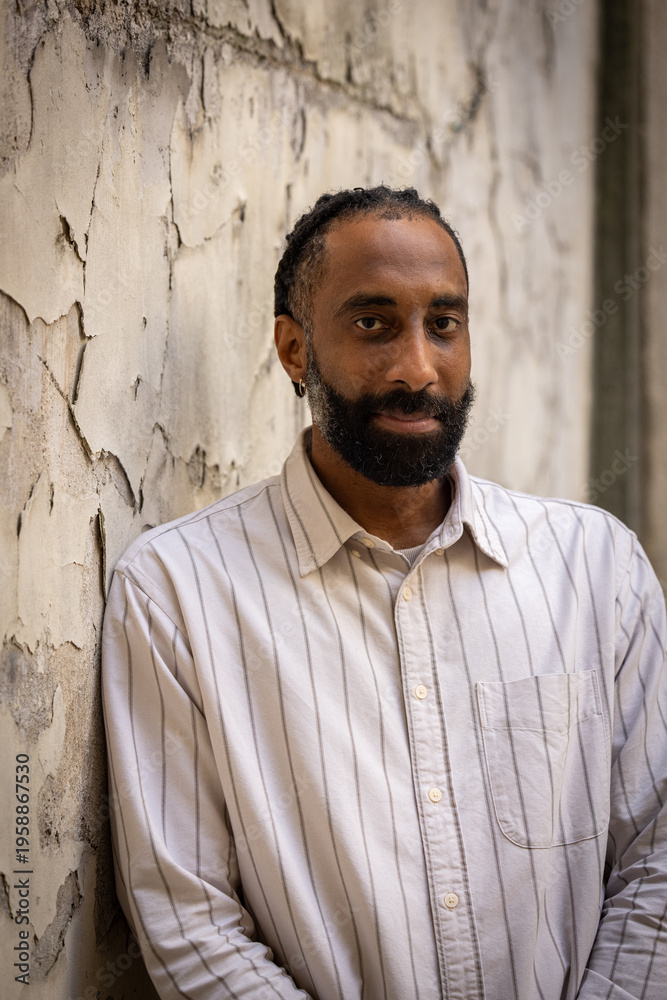 Portrait d'un bel homme souriant, noir d'origine antillaise, barbu. Il est adossé à un mur. #1958867530