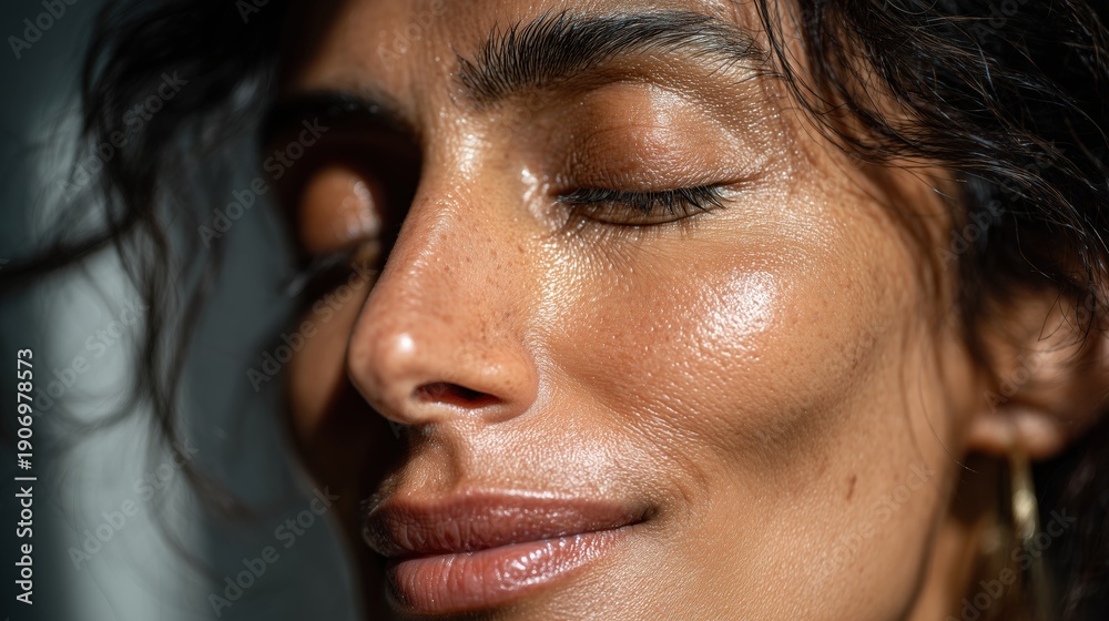 Portrait de profil d'une femme aux yeux fermés avec peau brillante #1906978573