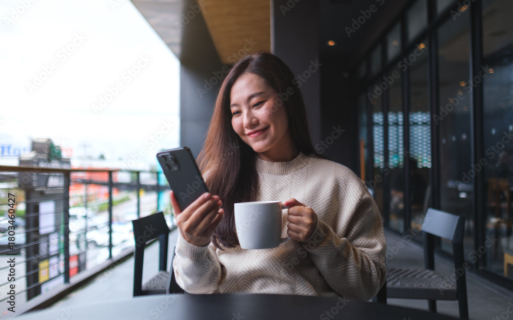 Portrait image of a woman holding and using mobile phone while drinking coffee in cafe #1803460427