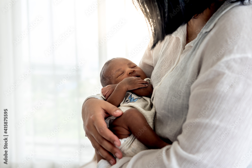 Portrait images of half African half Thai, 12-day-old baby newborn son, sleeping with his mother being held, to family and infant newborn concept. #415875595