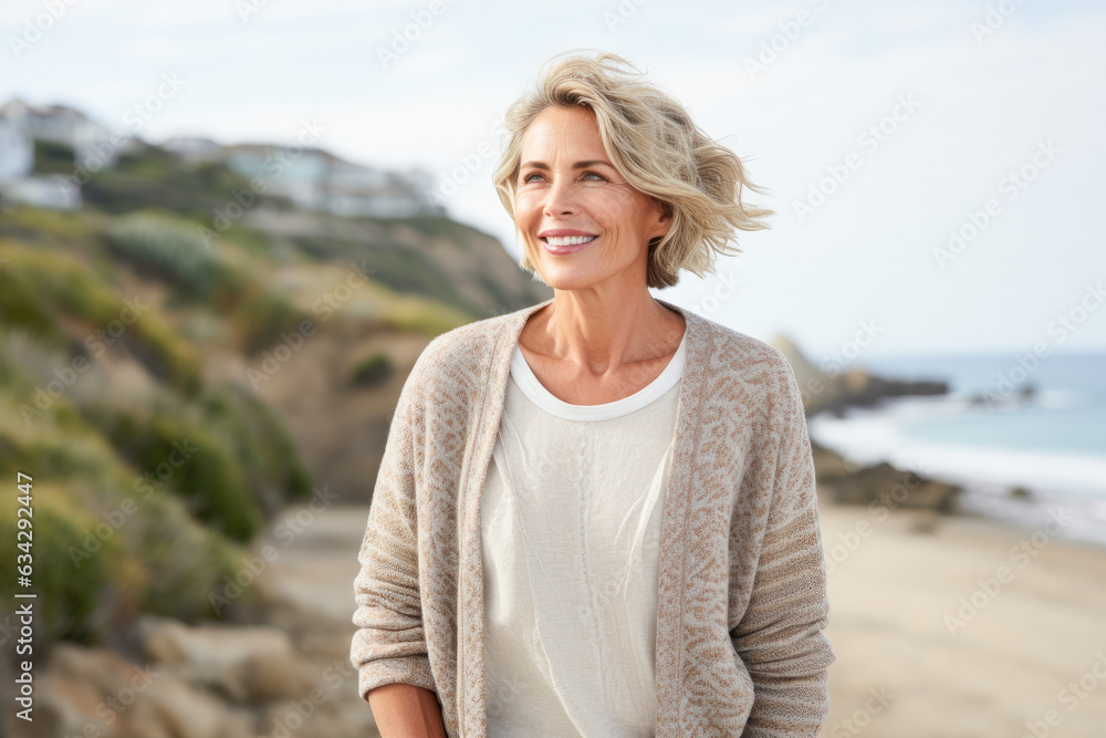 Portrait in the beach of a pleased 50 years old woman. #634292447