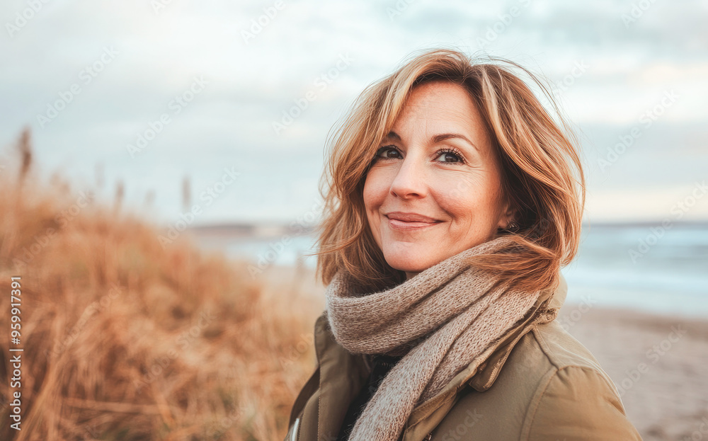 Portrait in the beach of a pleased 50 years old woman in fall. Lifestyle portrait photography of a satisfied woman in her 50s against a beach background. #959917391