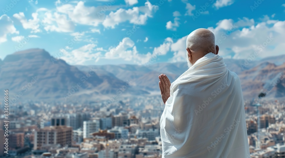 Portrait of a bald man wearing a white religious shirt praying on top of a mountain. #830169846