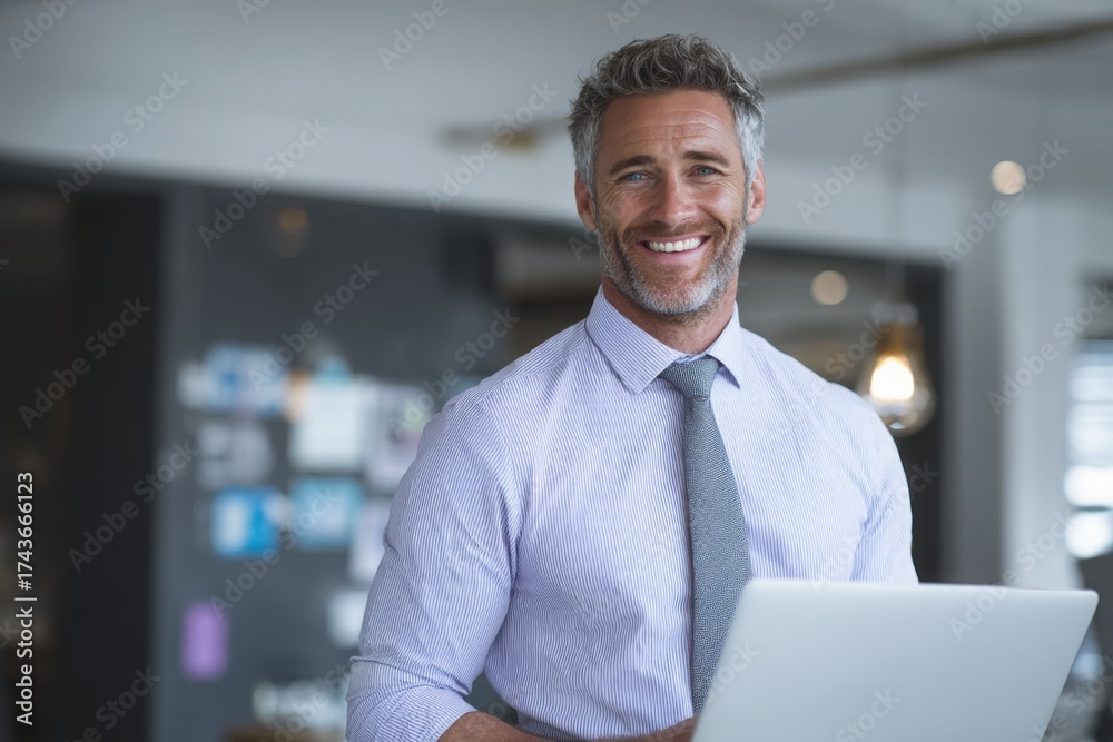 Portrait of a cheerful professional man in office attire, smiling while using a laptop in a modern corporate setting. #1743666123