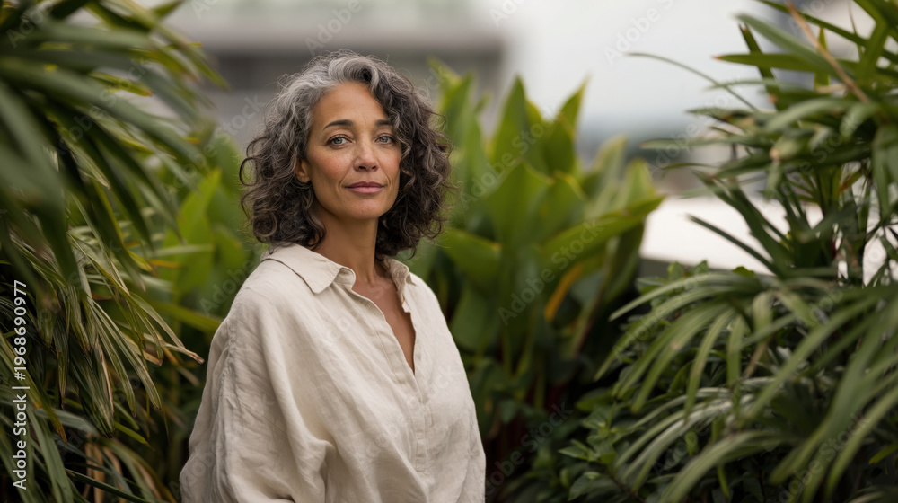Portrait of a confident woman in her early forties with natural silver gray curly hair wearing a relaxed linen shirt #1968690977