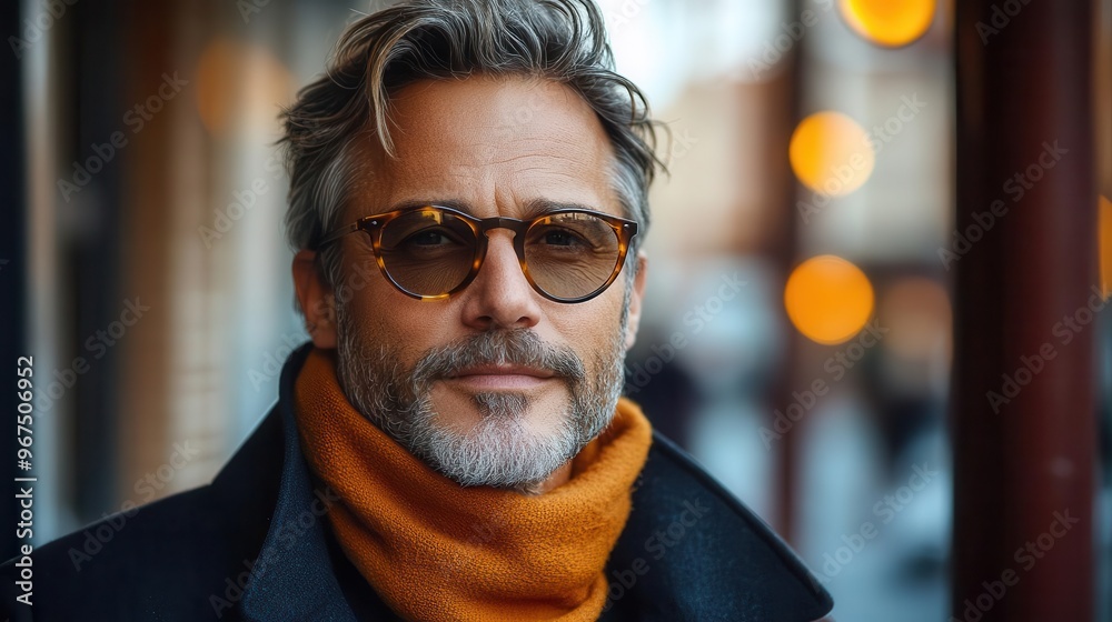 portrait of a distinguished middleaged man with saltandpepper hair and designer sunglasses casual yet stylish attire exudes confidence and sophistication against an urban backdrop #967506952