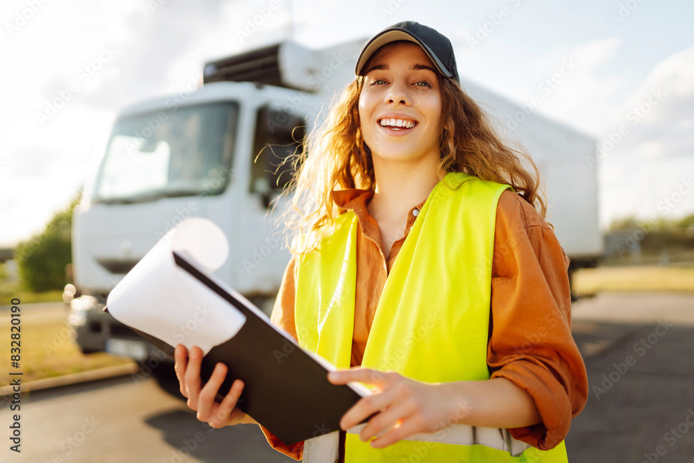 Portrait of a female trucker standing in front of truck and looking at camera.Transportation services. Logistic shipping. #832820190