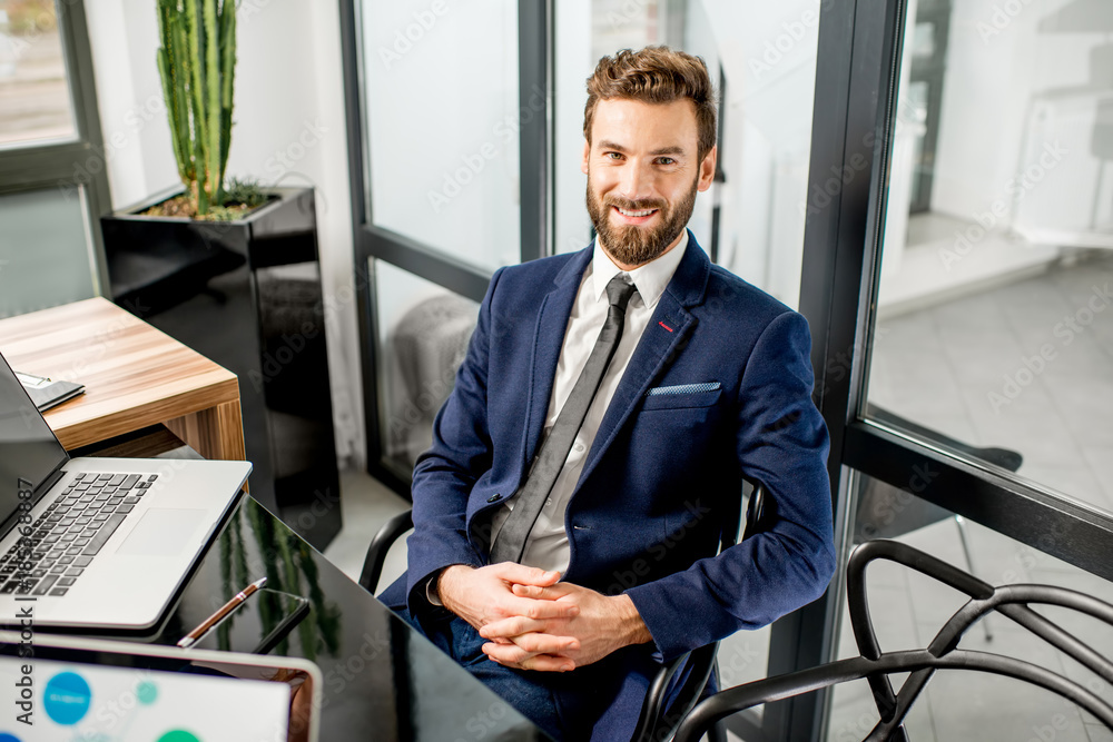 Portrait of a handsome banker working with laptop sitting at the luxury office interior #185368887