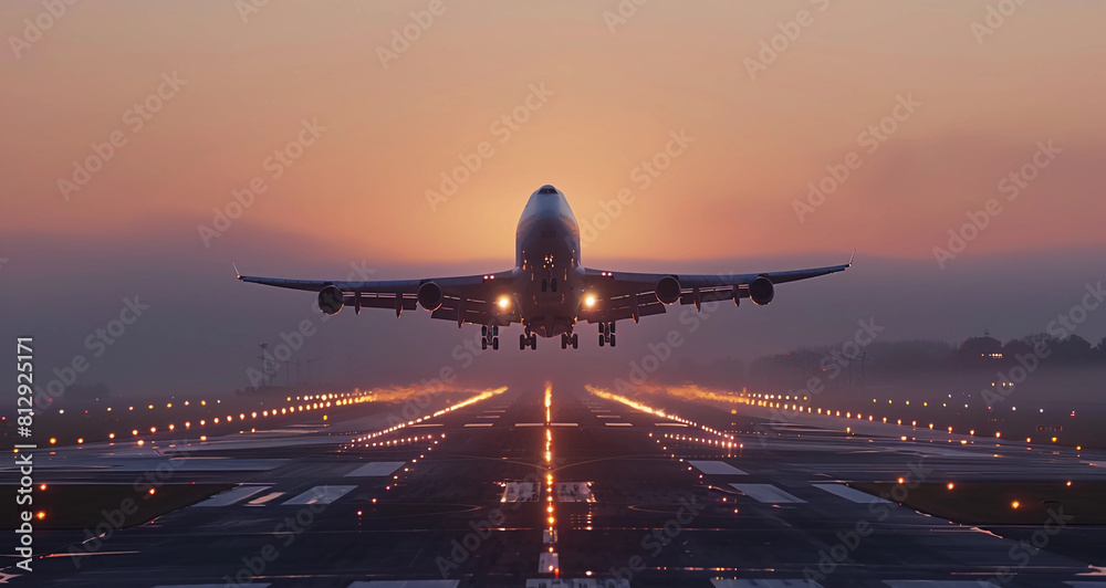 Portrait of a jumbo jet taking off from an airport runway in the night with lights in the background #812925171