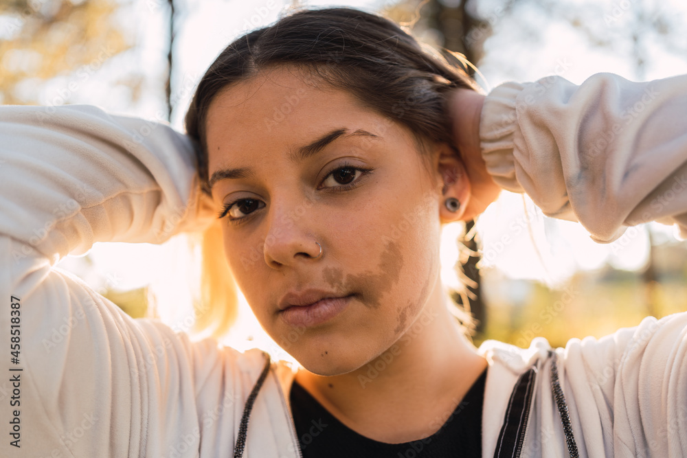 Portrait of a pretty girl with a birthmark on her face in the open air sunset. #458518387