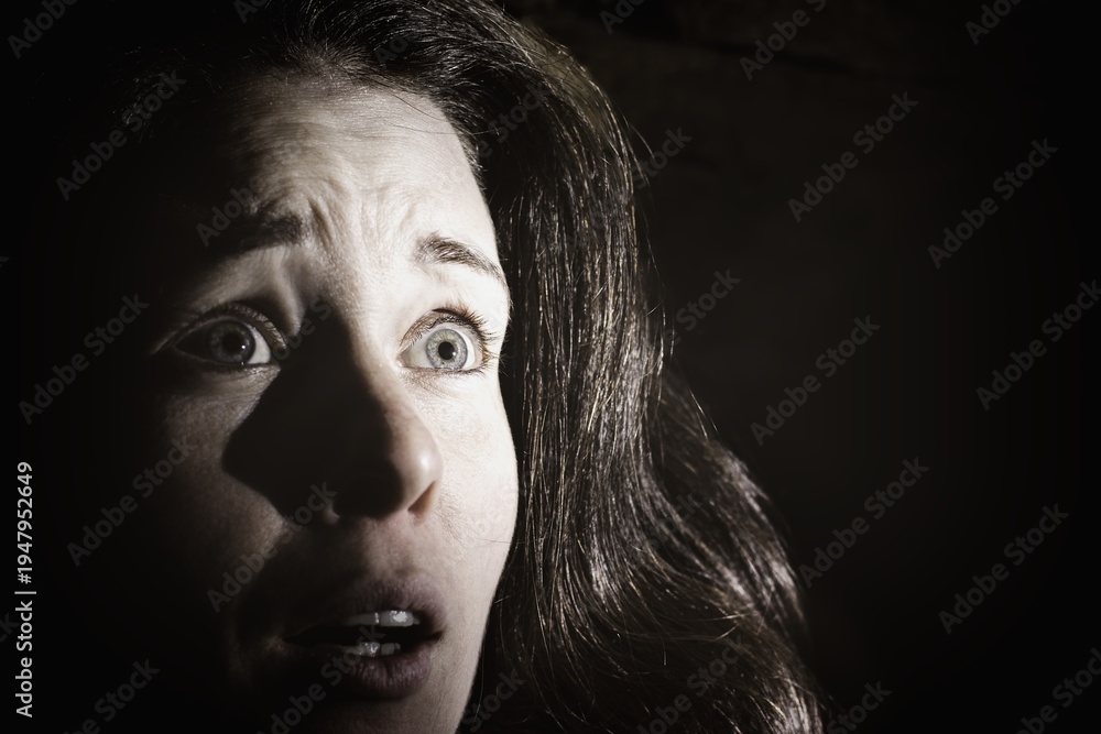 Portrait of a scared woman. Anxiety, fear, panic expression. #1947952649