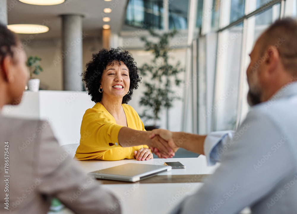 Portrait of a young businesswoman and businessman shaking hands introducing each other during a meeting or conference in the office #1786575424