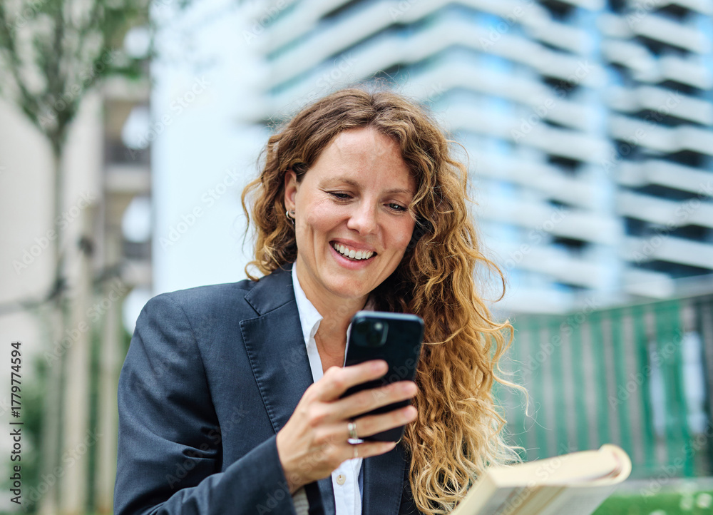 Portrait of a young businesswoman woman using a smartphone mobile phone and holding and reading a book sitting on a bench in park, surrounded by moder corporate office buildings #1779774594