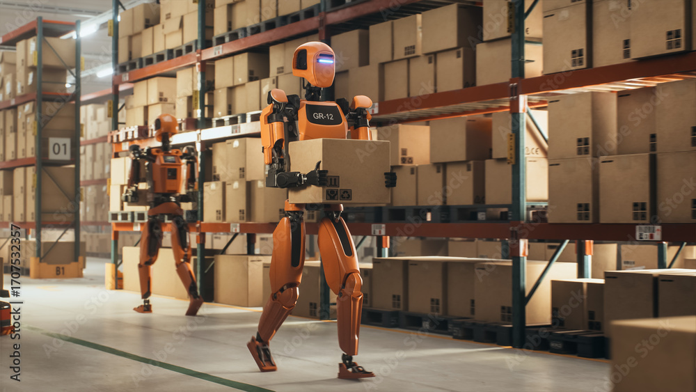 Portrait of an Advanced Humanoid Robot Carrying a Cardboard Delivery Box Across an Industrial Warehouse Floor. Future of Automated Logistics, Storage and Shipping Concept #1707532357