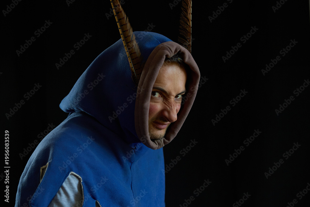 Portrait of an angry man in a medieval hood with pheasant feathers on a black background #1956083539