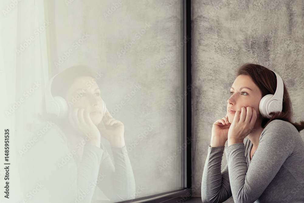 Portrait of beautiful сaucasian young woman in headphones dreaming, enjoying listening music standing near big panoramic window of apartments. #1485951535
