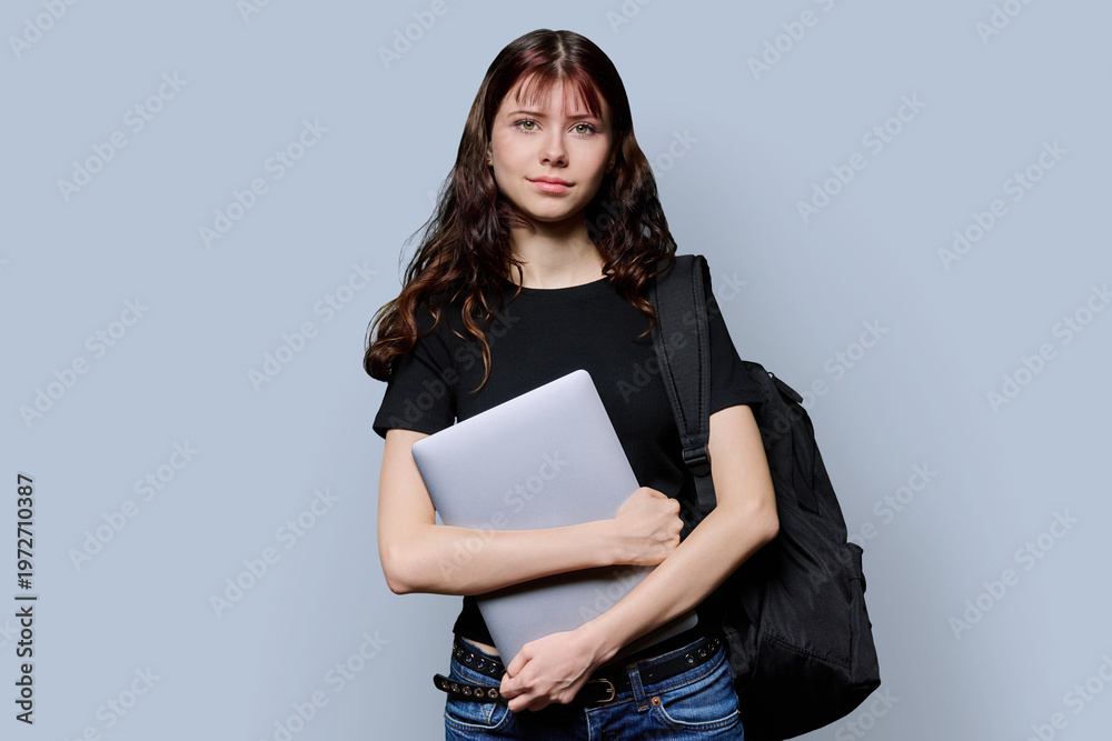 Portrait of beautiful girl teenage student with backpack, laptop on gray background #1972710387