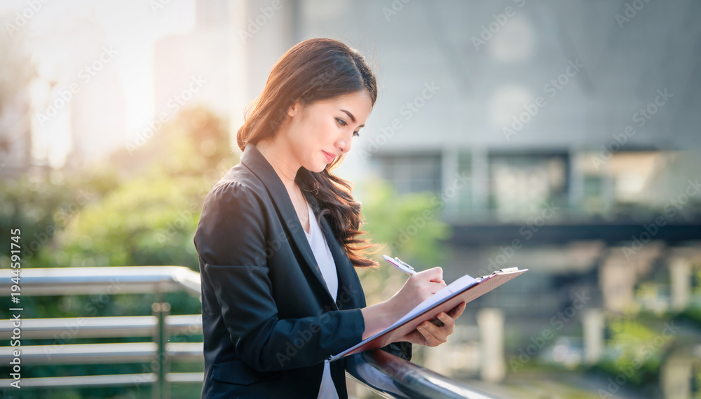 Portrait of business woman happy smile holding check list on clipboard and pen. #1944591745