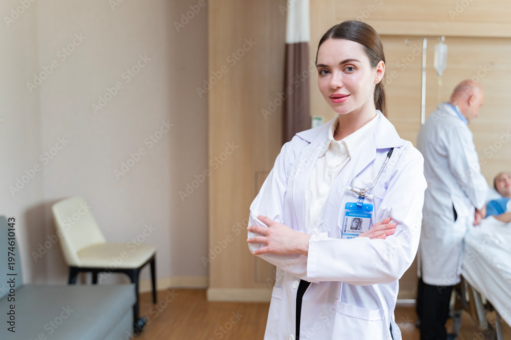 Portrait of caucasian woman doctor in patient wing inside hospital for healthcare and medical usage #1974610143