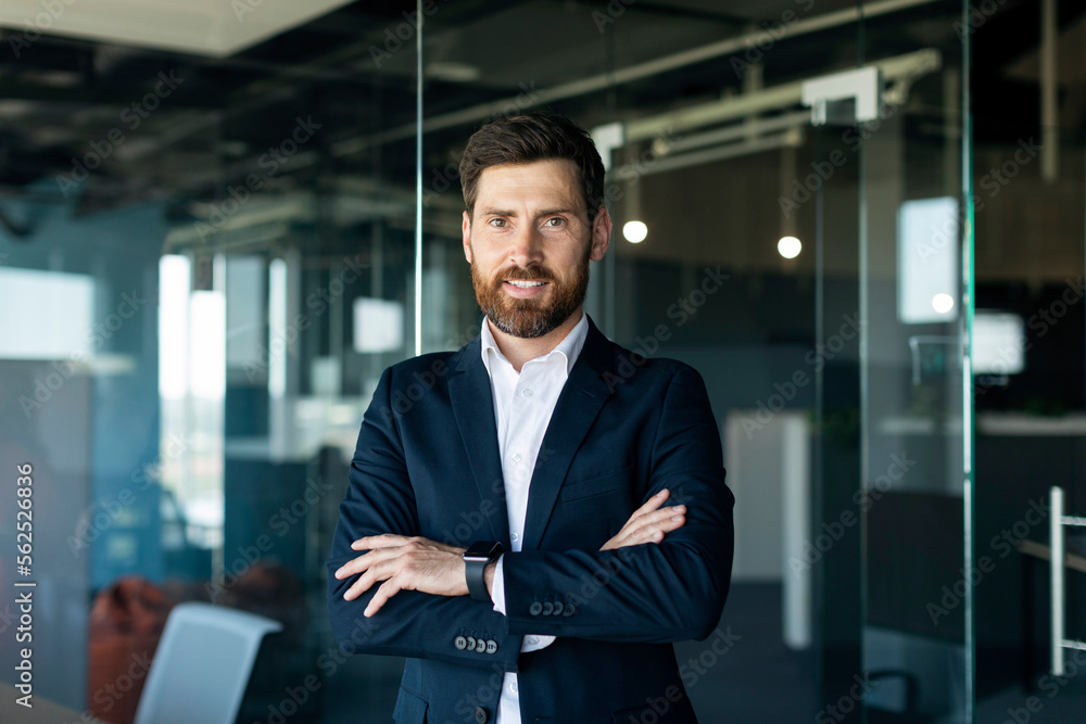 Portrait of confident smiling middle aged businessman in formal wear posing with crossed hands in office interior #562526836