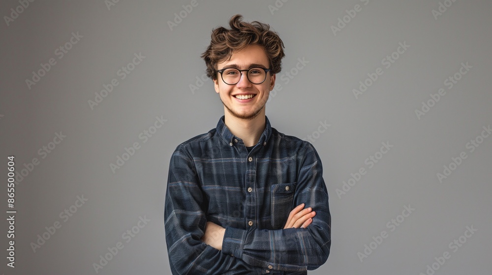 Portrait of handsome young smiling man with glasses standing over a grey background. #865500604