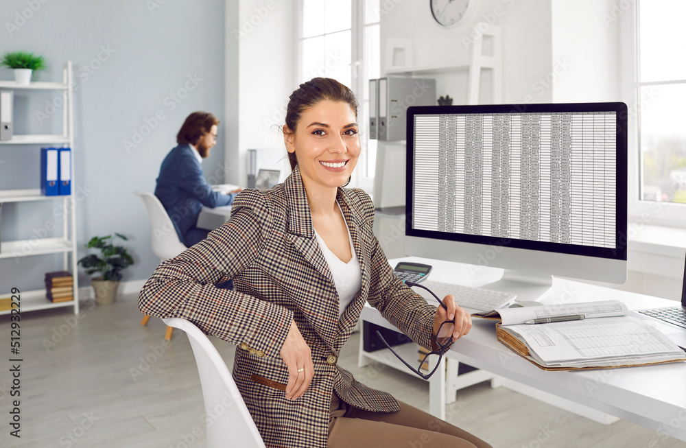 Portrait of professional financial accountant at work. Happy cheerful beautiful young woman in suit sitting at office desk with modern desktop computer, holding glasses, looking at camera and smiling #512932229