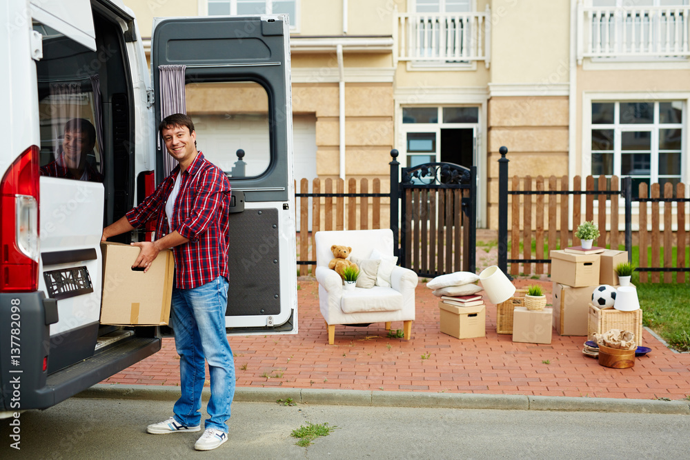 Portrait of smiling man unloading cardboard boxes from transportation van in driveway of his new big house #137782098