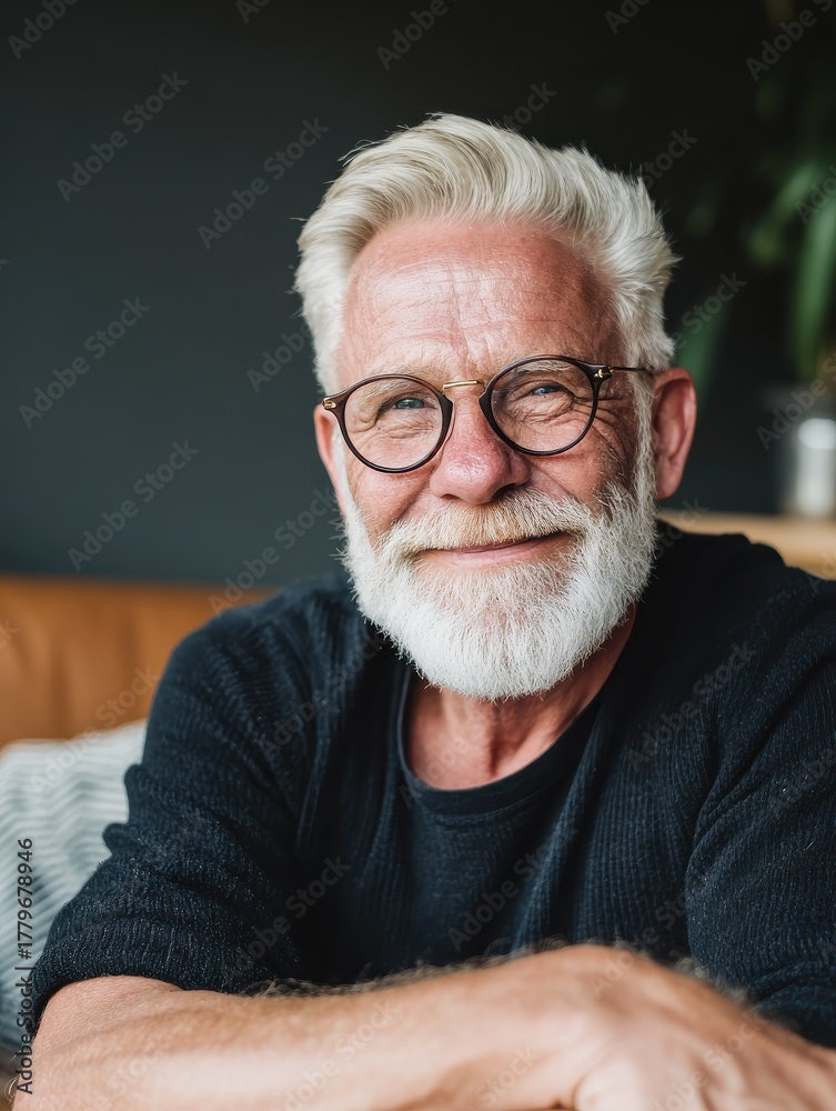 portrait of smiling senior man looking at camera handsome old man with white hair wearing eyeglasses with satisfaction close up face of proud and satisfied mature male sitting on couch no logos no br #1779678946