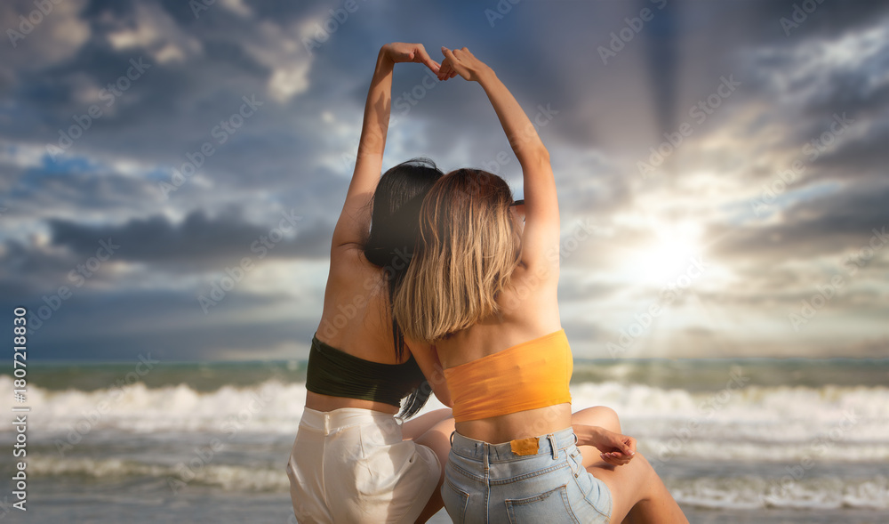 Portrait of two women sitting and raised arms on summer tropical beach vacation at sunset. Vintage tone #1807218830