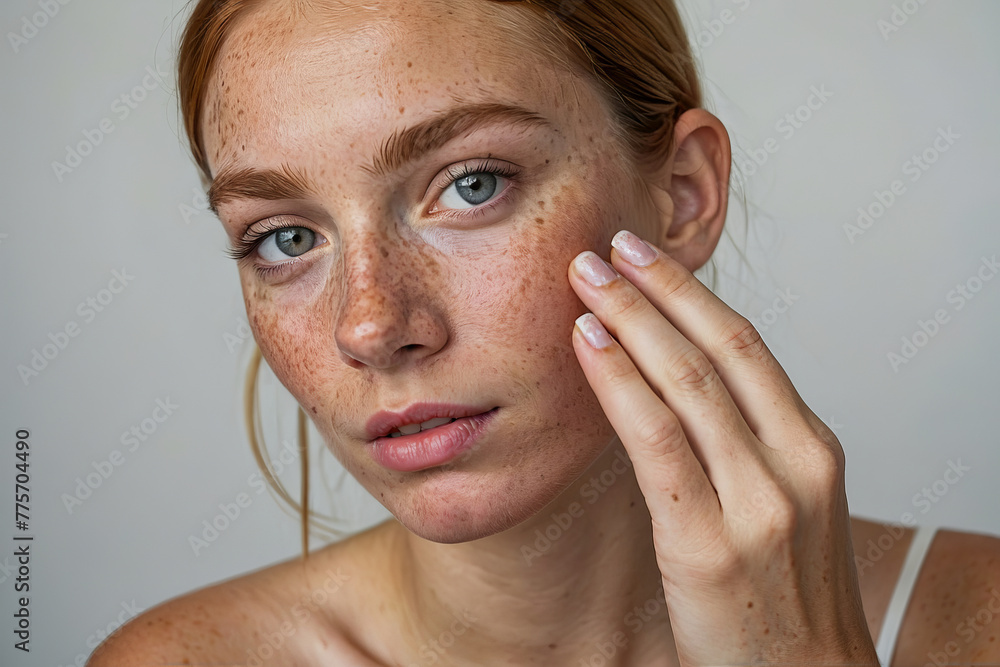 Portrait of woman face with freckles touching skin by hand on white background #775704490