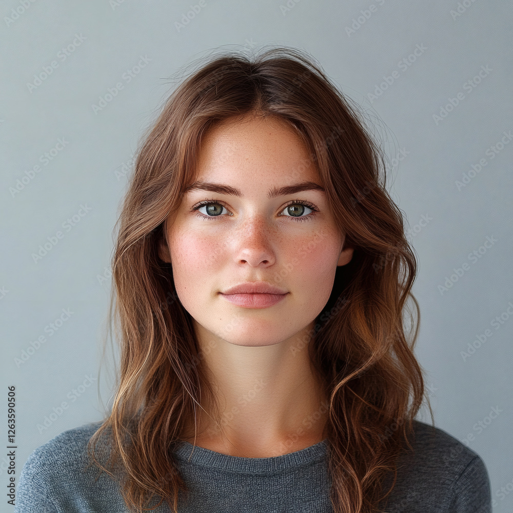 Portrait profile or passport photo of a young woman with long dark brown hair #1263590506