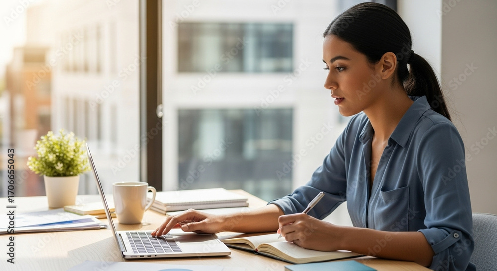 Portrait young latina or indian business woman using laptop pc working at desk writing notes, watching educational online webinar. Female student looking at computer screen device, studying in office #1706655043