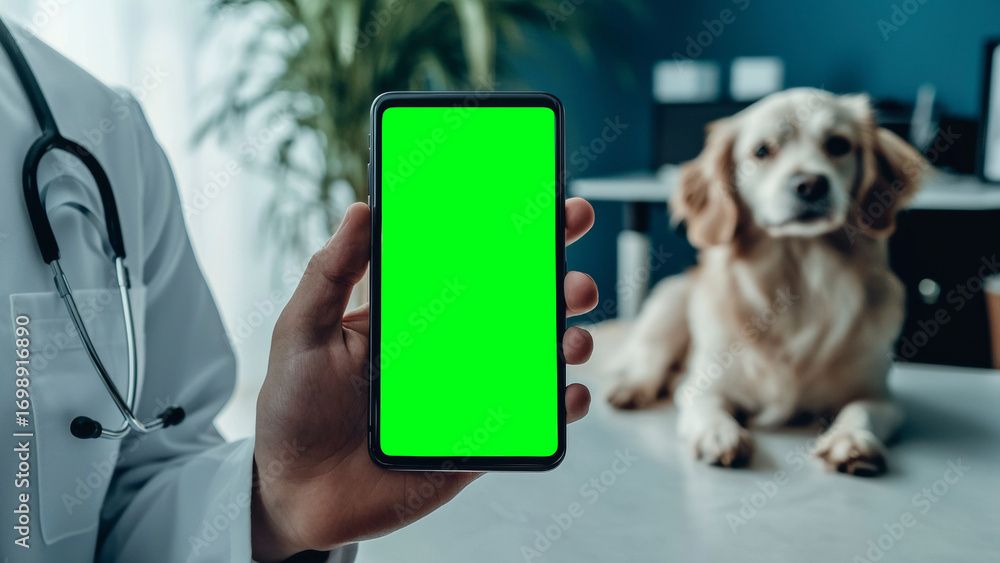 Poster for a veterinarian clinic with a green screen phone for branding. #1698916890