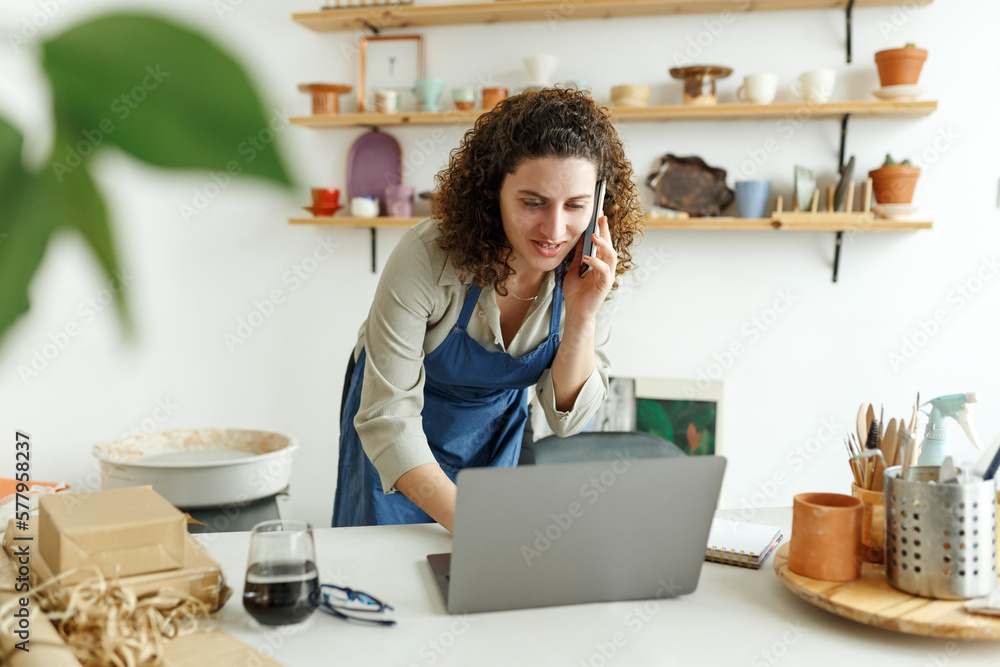 Potter entrepreneur using laptop in workshop, smiling #577958237