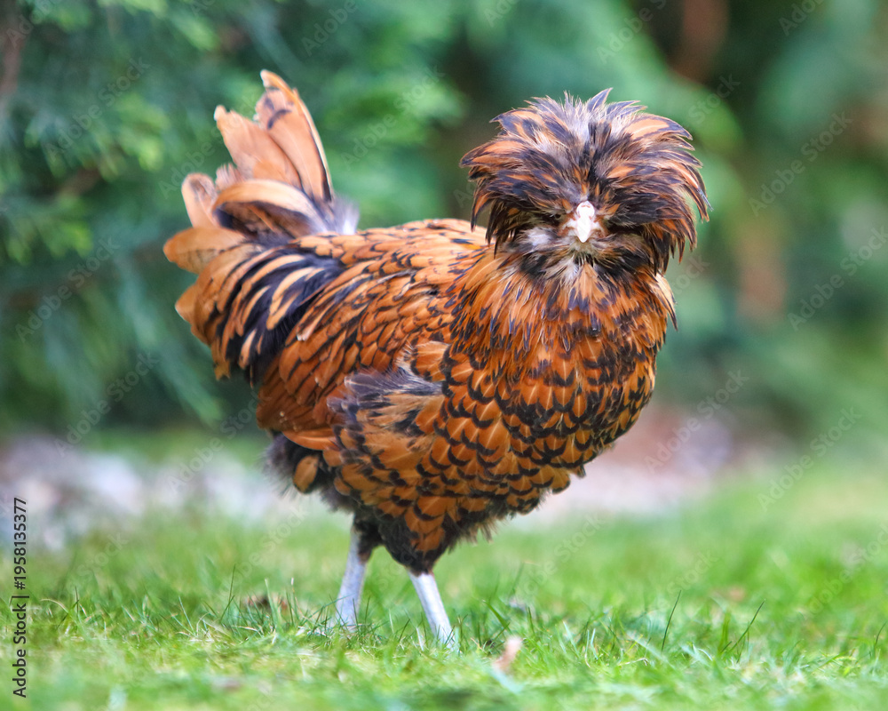 Poultry Farming And Rare Breeds Golden Laced Padovana Polish Chicken Walking On Green Grass In A Garden Setting Representing Sustainable Agriculture #1958135377